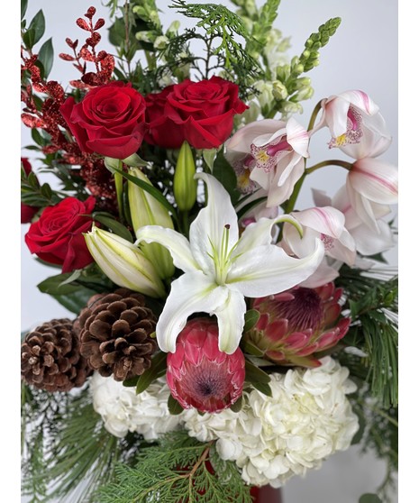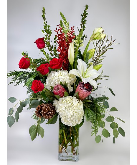 Absolutely Gorgeous! A beautiful mix red roses, snapdragons, white hydrangea, lilies, protea and so much more.