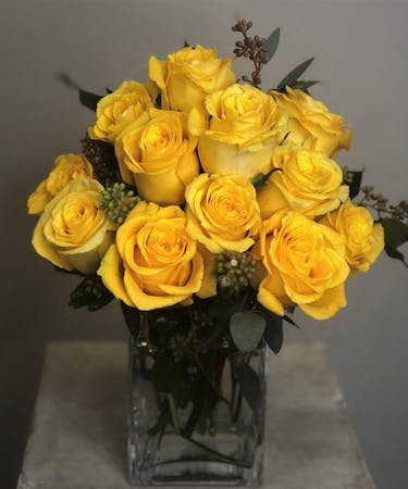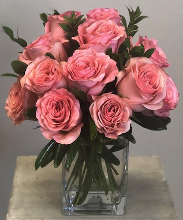 Our own darling roses - designed in a compact pave style in a contemporary cube vase. Can't get them anywhere else - just here. Choose from Red, Yellow, Pink, Hot Pink, Peach and White. Only available for local delivery.