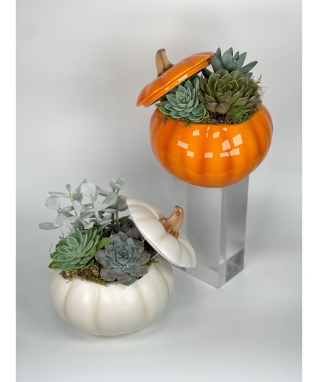 A traditional orange ceramic pumpkin with an assortment of delightful succulents. Plant selection will vary.