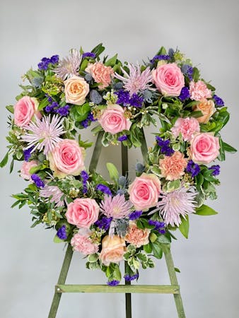 The Pastel Garden Heart standing arrangement is a tender and visually stunning tribute, meticulously crafted with an array of peach, lavender, and blush florals. This lovingly created heart symbolizes the depth of emotion and compassion felt during times of remembrance or significant farewells.
