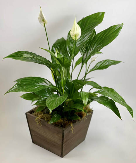 The Spathiphyllum Plant, commonly known as the Peace Lily, is a beautiful plant to help convey your wishes for tranquility and sweet serenity. An ideal gift for most occasions, this lush plant displays white conical blooms perfectly presented in a wooden box to make it a natural fit for any interior decor.
