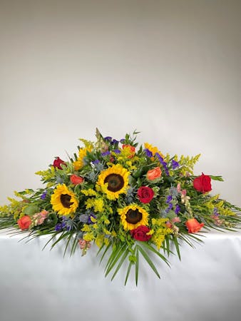 This casket spray, created with beautiful florals in all colors of the rainbow - will express your heartfelt thoughts to everyone in attendance.
