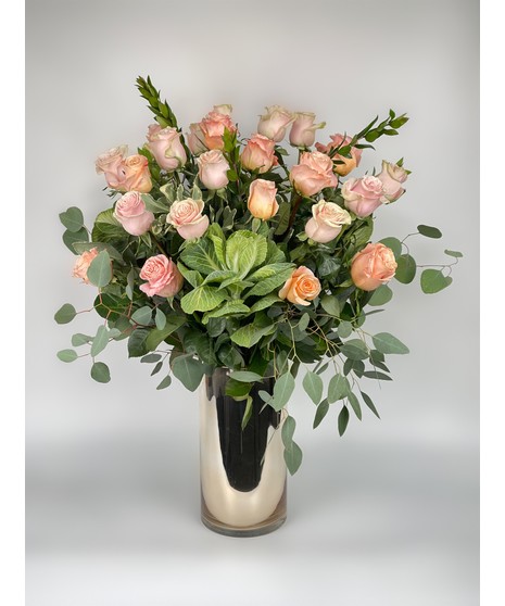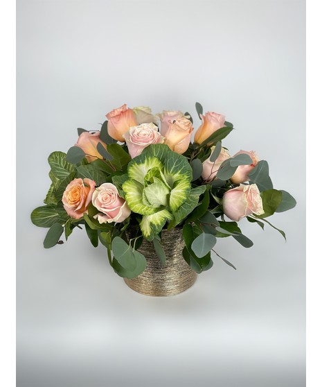 Our own darling roses - designed in a compact pave style in a contemporary gold/rose gold vase. With pastel pink and peach roses, kale and some lush greenery. Can't get them anywhere else - just here. Choose from standard or deluxe. Only available for local delivery.