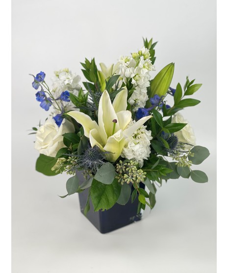 Sapphire Skies is a sophisticated floral arrangement that speaks volumes in its gentle hues and soft, embracing textures. The color palette centers around serene white lilies and roses accented with vibrant blue delphinium. A perfect mix for any occasion, Sapphire Skies is designed in a rich cobalt blue cube vase, grounded in modern sophistication.