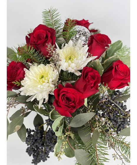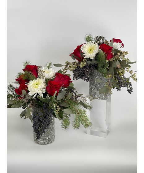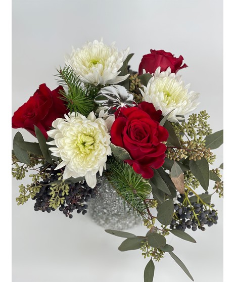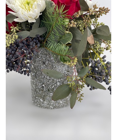 Beautiful winter arrangement in a "Sparkling" silver bead vase. Perfect for any holiday festive occasion!