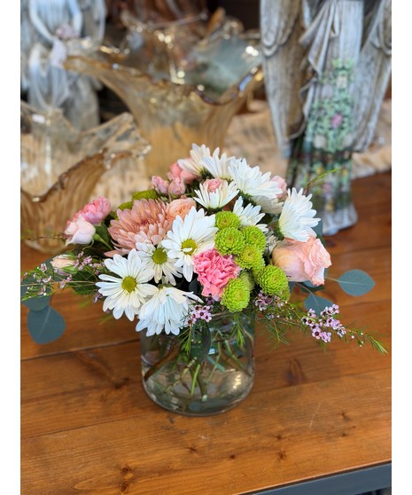 Sweet Surprises Bouquet is an absolutely charming way to send your warmest sentiments. Gorgeous peach roses, white daisies, blush pink spray roses, peach cremons and green buttons amidst lush greens are sweetly situated in a classic clear glass vase to create a bouquet that will delight your special recipient at every turn!