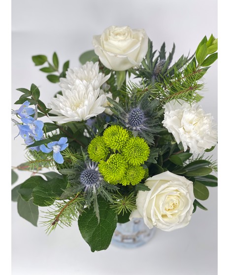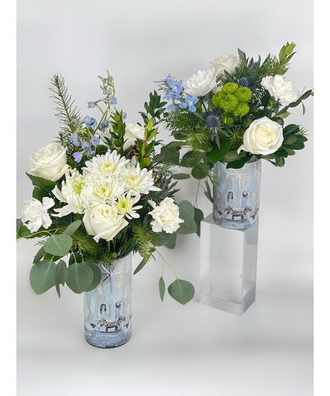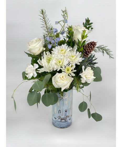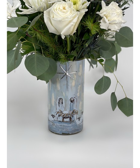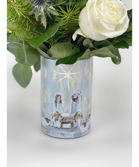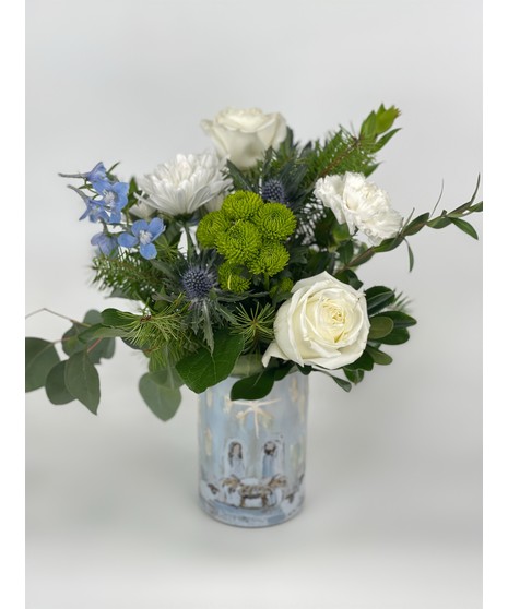 A modern mix of white florals, and Christmas greenery, with blue accents in a vase depicting the holy family.