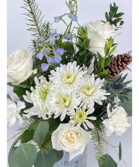 White Christmas is an exquisitely modern floral arrangement that captures the serenity and elegance of the holiday season. A medley of white blooms, fresh Christmas greenery, and blue accents come together in glass vase container, creating a harmonious blend of tradition and contemporary style. The white florals at the heart of this arrangement are selected for their pristine beauty and include varieties that may range from soft, voluptuous roses to delicate delphinium. Each flower is a symbol of winter's pure snowfall, and together they exude a quiet sophistication. The blooms are complemented by the rich textures of holiday greenery, including pine and fir branches that invoke the festive spirit with their aromatic presence. Presented in a glass vase depicting the holy family, this arrangement strikes a perfect balance between charm and modern chic.