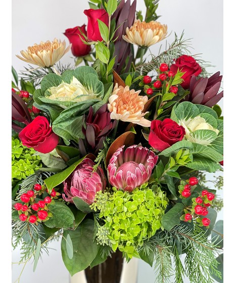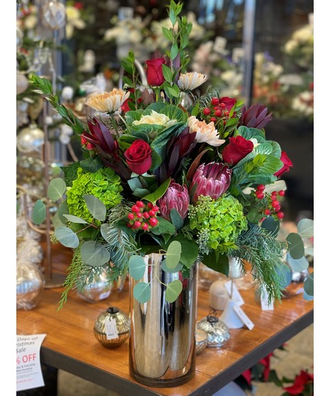 Beautiful winter arrangement in a gold colored vase. Perfect for any occasion!