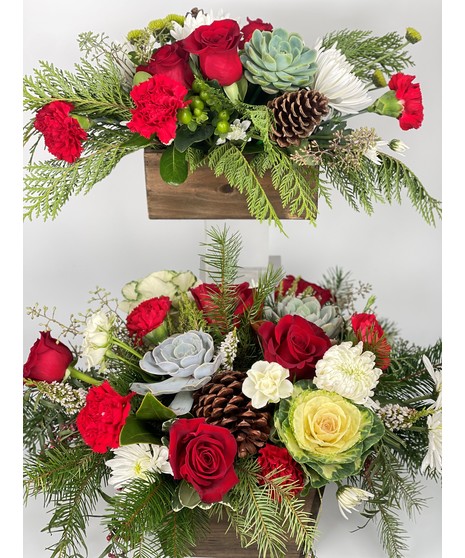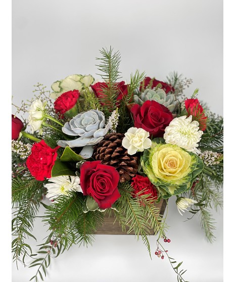 The perfect Christmas arrangement in an on-trend wooden box - ideal as a centerpiece as well as a beautiful arrangement to celebrate the season.