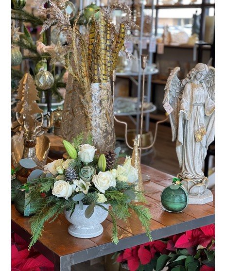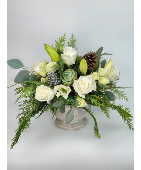Each element is thoughtfully chosen and artfully placed, creating a balance between the untamed beauty of the wild and the cultivated grace of floral artistry. The fragrant greens evoke a walk through a snowy forest, while the winter-white flowers are reminiscent of the season's first delicate snowfall. Pine cones add a touch of woodland whimsy, and the succulents—a surprise amidst the more traditional holiday elements—bring a modern twist and symbolize endurance and timeless strength. The composition is housed in a shimmering mercury glass bowl, whose reflective surface adds a touch of festive sparkle and sophistication. The bowl captures the glow of holiday lights and the warm ambiance of winter evenings spent indoors, making it a stunning centerpiece that will draw the eye and warm the heart.